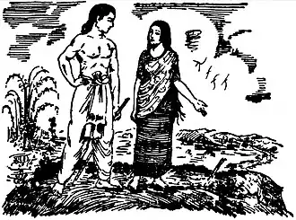 Khamba had a dream.[7] In his dream, Goddess Ayangleima (either Panthoibi or Koiren Leima) appeared to him in the form of Khamnu and asked him to fetch vegetables. Khamba woke up and wondered about the dream. The god Thangjing made him think that he had truly seen his sister. So he rowed a boat onto the lake, but he went in the wrong direction. The god Thangjing sent clouds and storms over the hills, and the wind blew the boat towards where Thoibi was fishing. Thoibi saw Khamba standing nearby. She asked Khamnu if she knew the strange man disobeying the royal order. Khamnu said no. Khamba did not know what to do. Hearing his sister's voice, he came closer. Thoibi saw that he was handsome, manly, muscular and well fashioned. Khamba was also amazed at Thoibi's beauty and glamour. It was God's will that they should be lovers. Khamnu worried that her brother might be punished for disobeying the king. Thoibi noticed that some of the fabric in Khamnu's clothes matchied Khamba's headdress. She also saw that Khamba was wearing the bracelet she had given to Khamnu. Later, Khamnu admitted that this man was her brother. Then, Thoibi became kind to Khamba. She offered him delicate foods. She pleasantly told him to go home before the king's noticed he was there.[8]