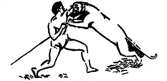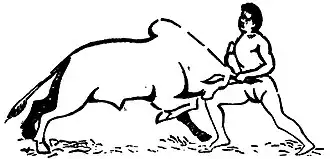 On the day of the event, Khamba stood face to face with the bull. The bull charged towards him, but Khamba dodged. The audience asked him if he was afraid. Khamba said that he was waiting for a good position. Then, he stood on firm ground and caught the bull. The mighty bull carried him away into the thick woods.[16] Khamba did everything his sister said. Immediately, the feral bull became tame. Khamba began to bring the bull back to the colosseum. Kongyamba intercepted him and pretended to help Khamba to hold the bull, but when they came within view of the spectators from the two kingdoms, Kongyamba claimed that he had captured the bull himself. He claimed he had even rescued Khamba, who had fallen into the ditch. Once again, there was a great conflict between Khamba and Kongyamba. The two kings could not tell who spoke the truth. So, Kongyamba was asked to fight the bull within an enclosure. But Kongyamba became frightened of the bull and climbed up the wall to get away from it. Khamba faced the bull bravely. He once again captured the bull.[16] Both the kings honoured Khamba and gave him gifts. Since Khamba was of Khuman blood, the Khuman king asked the Moirang king to let Khamba live in the Khuman kingdom. The Moirang King did not agree.[16]