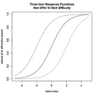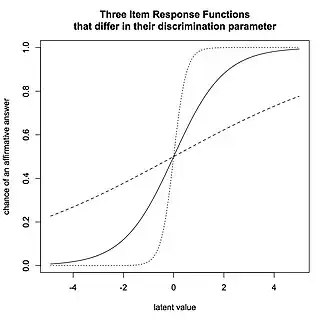 The Double Monotonicity model adds a fourth assumption, namely non-intersecting Item response functions, resulting in items that remain invariant rank-ordering.[11] There has been some confusion in Mokken scaling between the concepts of Double Monotonicity model and invariant item ordering.[12] The latter implies that all respondents to a series of questions all respond to them in the same order across the whole range of the latent trait. For dichotomously scored items, the Double Monotonicity model can mean invariant item ordering; however, for polytomously scored items this does not necessarily hold.[13] For invariant item ordering to hold not only should the item response functions not intersect, also, the item step response function between one level and the next within each item must not intersect.[14]