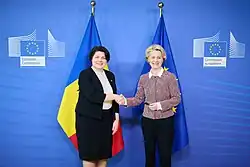 In the backdrop of the 2022 Russian invasion of Ukraine, President Maia Sandu signed a formal application for EU membership on 3 March 2022.[29] On 7 March, the EU said it would formally assess Moldova's application.[30] On 11 April, the Minister of Foreign Affairs and European Integration of Moldova Nicu Popescu received a questionnaire from the European Commission (EC) following a meeting with the European Commissioner for Neighbourhood and Enlargement Olivér Várhelyi as a result of Moldova's application for candidacy.[31] Their response to the first part of the questionnaire was submitted back to the EC through the Delegation of the European Union to Moldova's head Janis Mazeiks by the Prime Minister of Moldova Natalia Gavrilița on 22 April,[32] while the responses to the second part were submitted on 12 May 2022.[33]