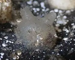 Molgula, or sea grapes, are very common, globular, individual marine tunicates roughly the size of grapes.[1] Molgula are a genus of the class ascidians, having many species sized from 20–50 mm and that has a life cycle with a tailed tadpole stage or without a tailed tadpole stage. [2][3] Molgula are sessile invertebrates that grows on substrates and are always found existing alone.[2] There are over one hundred species of molgulids with a vast majority of them in the Northern and Southern parts of the world with a few along the equator.[4][2] All species of Molgula are suspension feeders and will have the highest population in areas with high amounts of small particles to feed on.[4]