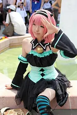 Like her sisters, Momo also has pink hair (but much shorter than theirs). Unlike her twin sister Nana, she has a much sweeter, more friendly and calculating personality, but when she gets angry, she is the most terrifying and sadistic of the three sisters, completely changing her character and the way of doing things. Momo is highly intelligent (although less than Lala) and is an expert in the field of extraterrestrial plants. She has a much more mature mentality in some respects, especially when it comes to sex, than her sisters. Similar to Nana, Momo loves to dress in a Gothic Lolita style, albeit her attire generally consists of black and green colours, as contrary to her sister's, which is of black and red.[4] Among other things, Momo's tail is particularly sensitive, so much so that it can weaken her at the mere touch of a person, in addition to provoking arousal in her (in fact, Momo sometimes touches her tail to vent her own instincts).[5]