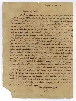 His relationship with his son Giacomo, of which we have testimony in the latter's Epistolario,[6] was profound but suffered, as is inevitable in an encounter, albeit bound by reciprocal affection, between two diametrically opposed temperaments with a completely different conception of life.[4] The 210 letters exchanged between Monaldo and his son from 1810 to 1837 - the year of the poet's death - allow the reader to reconstruct in detail the delicate and difficult relationship between the two. Of fundamental importance is the letter that Giacomo entrusted (at the end of July 1819) to his brother Carlo when he was preparing to run away from home and which Monaldo never saw because the attempt at «escape» was thwarted (the passport Giacomo had asked of the friend of the family, count Saverio Broglio, ended in Monaldo's hands). This letter is a precious document for understanding the heated protest of the twenty-one year old poet who rebels against his gloomy relegation to the loved-hated town of his birth without repudiating his sincere affection for his father – in fact asking to be excused for his painful choice firmly records his awareness of his greatness and his presentiment of his destiny («I had rather be unhappy than insignificant»).
