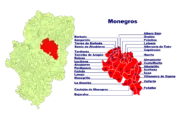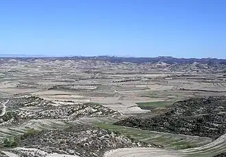 Los Monegros is a comarca in Aragon, Spain. It is located within the provinces of Zaragoza and Huesca. The area is prone to chronic droughts, and much of the area is a natural region made up of badlands.