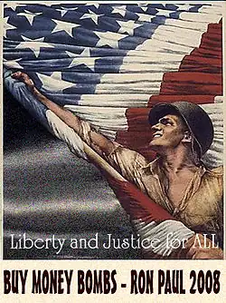 Moneybomb (alternatively money bomb, money-bomb, or fundraising bomb) is a neologism coined in 2007 to describe a grassroots fundraising effort over a brief fixed time period,[1] usually to support a candidate for election by dramatically increasing, concentrating, and publicizing fundraising activity during a specific hour or day. The term was coined by Trevor Lyman to describe a massive coordinated online donation drive on behalf of presidential candidate Ron Paul, in which context the San Jose Mercury News described a moneybomb as being "a one-day fundraising frenzy".[2] The effort combines traditional and Internet-based fundraising appeals focusing especially on viral advertising through online vehicles such as YouTube, Twitter, and online forums. In the case of lesser-known candidates it is also intended to generate significant free mass media coverage the candidate would otherwise not receive. Moneybombs have been used for grassroots fundraising and viral activism over the Internet by several 2008 presidential candidates in the United States.[3][4][5] It emerged as an important grassroots tool leading up to the 2010 midterm elections and 2012 presidential election in the United States.[6]