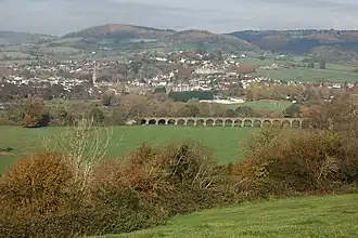 View of Monmouth from South at Penallt, with railway bridges and viaduct in the foreground.