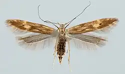 The wingspan is 12–14 mm. The forewings are very pointed, fuscous, mievenly sprinkled with ochreous-whitish, sometimes forming indistinct darker and lighter fasciae; an oblong ochreous-whitish suffusion in disc at 2/3 followed by a dark fuscous dot; a very indistinct ochreous-whitish tornal spot beneath this, and costal spot beyond it. Hindwings are grey.[2][3][4][5]