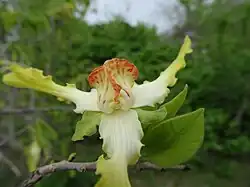 It is a tree reaching 12 meters in height. Its branches have lenticels. Its leaves are 20–24 by 1.5–8.2 centimeters and come to a point at their tips. Its petioles are 2–3 millimeters long. Its flowers are solitary and appear before young leaves. Each flower is on a thin, lightly hairy pedicel 2–5.7 centimeters long. Its flowers have 3 sepals that are 1–2 by 3–5.5 centimeters with wavy, densely hairy margins. The sepals curve backwards and are green or red with green veins. Its 6 petals are arranged in two rows of 3. The outer petals are light yellow with green or red highlights, curve backwards, and come to a point at their tips. The outer petals are 3.7–6.5 by 0.5–1.8 centimeters, have wavy margins, and are densely hairy on their outer surface. The inner petals are similarly colored, have a 0.7–0.9 centimeter long claw at their base and a 1.2–1.6 centimeter wide blade. Its stamens are 1 millimeters long. Its smooth, green and white fruit are 5–7.5 by 4-4.5 centimeters in diameter. Its light brown seeds are 1.3–2.6 by 1-1.8 by 0.9–1.1 centimeters.[3][5]
