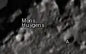 Mons Huygens is the highest mountain in the Moon's Montes Apenninus range. Adjacent to the west is Mons Ampère. The Montes Apenninus were formed by the impact that created Mare Imbrium. Mons Huygens rises 5,300 m (17,380 ft) from its Mare Imbrium base, per altimetry data from the Lunar Reconnaissance Orbiter.[1] The mountain was named after the Dutch astronomer, mathematician and physician Christiaan Huygens.[2] He is known for discovering Saturn's largest moon, Titan.