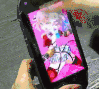 The game utilizes an "extreme rub" system (known officially as the "First Crush ❤ Rub" mode)[16] to seal cards:[17] "Poking, rubbing, and touching" the Vita's screen removes the character's clothing in stages, "from thick clothes to lightly dressed to skimpy bathing suit."[7][18] The sealing system is split into two parts: one requires the player to poke or tap on the female character's private parts and the other requires the player to stroke the entire screen on both sides of the system (pictured).[19] Touching the monster girls also causes their chest and thighs to jiggle in response.[15]