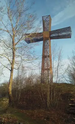 On the mountain top stands a high metallic summit cross, built in 1967. It was realised to replace smaller crosses settled there after the II World War. The realization of the project was promoted in 1965 by the parishes of Diocese of Chiusi, after the return of the local bishop from Rome where he took part in the Second Vatican Council. It was officially inaugurated on October the 1st of the same year by Brunetto Bucciarelli-Ducci, former president of the Italian Camera dei Deputati.[4] The lighting system was turned on for the first time June 29, 1968 at 9 o'clock in the evening, via radio control, by Pope Paul VI.[5] The cross is 10 metres wide, 15 metres high and its weight is 6.200 tonnes.[4]