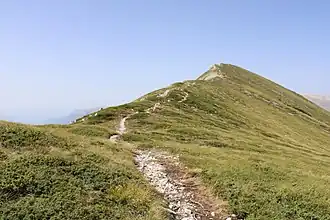 The mountaineering routes that traverse Mount Porrara consist of a number of trails that, in hiking circles, make it possible to reach its summit: the normal route traces an itinerary that crosses its crest after passing the wooded areas and the summit pastures and is a hybrid between the park path and the CAI's Grand Italian Trail[18] and is taken along the provincial road 12 Frentana, in the vicinity of the station of Palena,[6] while the direttissima route is formed by a pair of parallel paths,[8] in places overlapping and connected,[19] which originate from the Hermitage of Madonna dell'Altare, present on an altar-shaped rock that gives it its name, located along the eastern slopes of the mountain, and, after passing through wooded areas and shrubby pastures, climb up to the Pilate's Lodges,[10] natural terraces formed by stone boulders that bear the name of the character who characterized that place.[20]