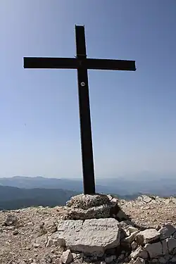 The mountain was referred to as "Palleno" in Roman times,[14] from which the name of the municipality of Palena derives, with the meaning of "meadow on a steep slope."[15] The name in use, with the literal meaning of "leek mountain," refers instead to the herbaceous plant of the same name that grows there wild at the low altitudes of the eastern slope.[11] Mount Porrara hosted at different times three saints who came there in prayer: saint Falco, a hermit in the 11th century in a cave located between the mountain and the remaining Maiella massif, Pope Celestine V, at the time Pietro Angelerio and also known as Pietro da Morrone, a hermit in the 13th century in the Taverna cave, and saint Nicola da Forca Palena in the 14th century.[3] In particular, Pietro da Morrone, who came from Castel di Sangro, dug his own dwelling himself, where he lived between 1235 and 1238, when he headed to Rome to receive the priestly habit.[16] During the latter century, the Congregation of the Celestines built there the Hermitage of Madonna dell'Altare on a rock, located in the vicinity of the cave where their founder lived, dwelling there until 1807.[17] In 1943, at the height of World War II, the Germans, given the strategic location of Mount Porrara and its proximity to the Gustav Line, built trenches there, of which the ruins remain, and converted the religious building into a prison.[17] Throughout its history and to some extent to this day its heights were used for cattle grazing.[10]