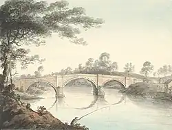 The bridge was Thomas Telford's first bridge design. It was built by John Carline and John Tilley between 1790 and 1792. It has three masonry elliptical arch spans, two of 55 ft, and the central one of 58 ft.[1]