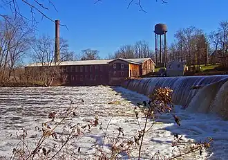 The river had been dammed at the mill location since at least the 18th century, and a grist mill had long existed opposite the mill site on the west bank of the river when Johannes Miller began seeking investors for what was to be at first a cotton mill in 1813.[1] It would be one of the earliest attempts to harness the Wallkill for industry. At that time wool came straight from locally farmed sheep and was completely processed at the mill.[2]