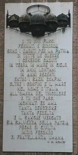 ("O you who pass by / stop and remember / they are those who died for their country / of all wars / the generous fallen / on land in sea in sky / in distant years / in recent years / within the sacred boundaries / beyond the borders and the sea / in the name of Italy / in the shadow of the tricolor / O you who pass by / bow down and love / so much devotion / so much loyalty / and blood shed / may it be the salvation of the country / pledge of civility / fruitful start / of human brotherhood / 1961")