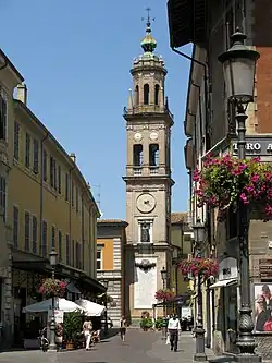 The Monument to the Fallen (Italian: Monumento ai caduti) consists of sculptures, reliefs and a plaque affixed in the 1960s to the 18th-century bell-tower (Torre di San Paolo) built attached to the now deconsecrated church of San Ludovico (previously dedicated to San Paolo and serving the adjacent Convent of that name. The bell tower is found at the intersection of Strada Macedonio Melloni, Borgo del Parmigianino, and Strada Cavour in central Parma, Italy.