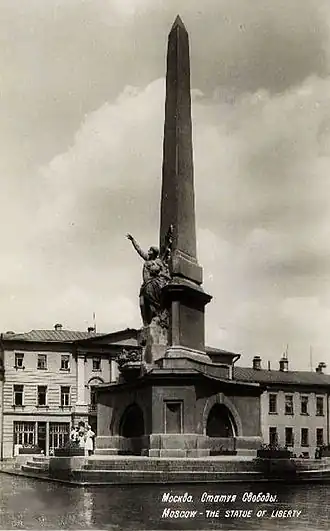 2. ^ From the beginning of the 19th century up to the October Revolution in 1917 only 11 monuments dedicated to individuals were erected in Moscow (not counting tomb statues at cemeteries). 4 of these 11 sculptures were taken down by the Soviet government: monument to Alexander II by Alexander Opekushin in Kremlin, monument to Moscow's governor prince S. Romanov also in Kremlin, monument to Alexander III by Alexander Opekushin near the Cathedral of Christ the Saviour in Volkhonka Street, and monument to General M. Skobelev by A. Samsonov at Tverskaya Square (former Skobelev Square) (Shefov, A., p.48, refer to the Sources section below).
