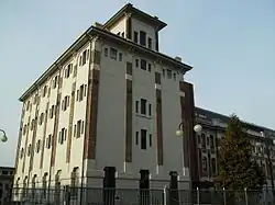 - Molini Marzoli Massari (built in the period 1906-1926 in Art Nouveau style, with sober floral decorations, by architect Silvio Gambini[44] for the Società Anonima Molini Marzoli Massari). It was a large wheat milling plant, designed for a potential of 500 quintals per day and facing the railroad before it was moved. The plant ceased operation in 1975, but was not demolished because of its historical and artistic interest. It was purchased by the municipality in 1985, and since April 15, 2000, it has housed the municipal cultural center and the headquarters of the University of Insubria (for the health biology degree program of the Faculty of Mathematical, Physical and Natural Sciences).