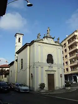 Existing chapels in the area include the 18th-century one dedicated to the Madonna di Caravaggio at the junction between Via Quintino Sella and Viale della Repubblica[13] (in which there are two canvases by Carlo Farioli from 1992 depicting the Blessed Bernardino and Giuliana from Busto) and the 19th-century one of Santa Maria Nascente[14] in Via Daniele Crespi, near Piazza Trento e Trieste. The latter was originally a rural aedicule located in what is now the square. It was then demolished in 1802 to make way for via Daniele Crespi. It was rebuilt two years later, and in the years between 1862 and 1864 it was moved to its current position and then incorporated into the palace that was built around it.[15] In the fresco on the wall there is a depiction of the plague, surmounted by the figure of the Virgin Mary. On the left accompanies her the pilgrim Saint Roch and on the right is Saint Sebastian.