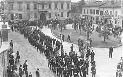A war memorial[38][39] was placed in the center of the Vittorio Emanuele II Square in front of it in 1958, which was dismantled on August 23, 2010 and then moved to Trento and Trieste Square. It was planned to restore the buildings in Vittorio Emanuele II Square by 2012, with the construction of an underground parking garage.[40]