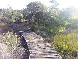 The main natural area is located several kilometres further down the road, past the visitors centre. Here, several looped trails go through kilometres of gradually recovering indigenous forest, and past a large elevated platform at the park's highest point, from which the surrounding region can be viewed.[4]