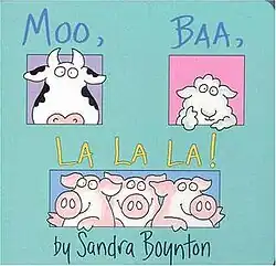 Moo, Baa, La La La! is a 1982 children's picture book written and illustrated by Sandra Boynton about various animals and the noises they make. It was published by Little Simon Books.