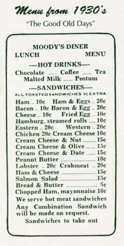 - ^ Erickson, Mary Anne (January 1, 2023). "Moody's Diner, still serving after all these years". www.maryanneerickson.com. Retrieved July 12, 2024.