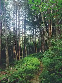 Moon Lake Recreation Area has diverse habitats from upland forests to low-lying wetlands near the lake. The upland forests are part of the Appalachian-Blue Ridge forest ecoregion.[3] Tree species include hickories, red maple, and tuliptree (Liriodendron tulipifera). On the lower slopes, red and white oaks are present. On the drier ridge tops and upper slopes, chestnut and both black and white oaks dominate. Conifer cover, including white pine (Pinus strobus) and eastern hemlock (Tsuga canadensis), is present throughout the park. The dense understory is various shrubs—particularly mountain laurel (Kalmia latifolia) and blackberry. Other understory species are present including hay-scented and New York ferns, striped maple, spicebush, black birch, and hornbeam.