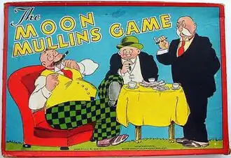 Moon Mullins merchandising[8] began when agent Toni Mendez arranged a licensing deal for Kayo suspenders. The wave of products that followed included such items as a series of Kellogg's Pep Cereal pins, a Milton Bradley board game (1938), salt and pepper shakers, perfume bottles, Christmas lights, bisque toothbrush holders, a set of German nodder figures, carnival chalkware statues, a wind-up toy handcar,[9] oilcloth and celluloid Kayo dolls, coloring books and a series of jigsaw puzzles (1943).