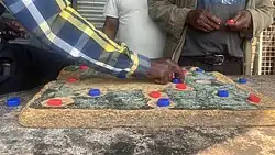 Morabaraba is a traditional two-player strategy board game played in South Africa and Botswana with a slightly different variation played in Lesotho. This game is known by many names in many languages, including mlabalaba, mmela (in Setswana), muravava, and umlabalaba. The game is similar to twelve men's morris, a variation on the Roman board game nine men's morris, which was based on the Egyptian game. The earliest known diagram of Morabaraba was found in an Egyptian temple in Kurna, Egypt, dating back to around 1440 BC. Other boards have been discovered in Ceylon / Sri Lanka (c. AD 10).