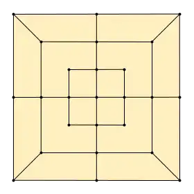 ![]() Morabaraba gameboard; pieces move from intersection to intersection along marked lines | |