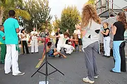 The Reunionais form of moraingy is less violent and more resembled the choreography and acrobatics of Brazilian capoeira than the original Malagasy form (which resembled that of Polynesian Kapu Kuialua). For example, the heel strike called talon zirondelles in moringue is equivalent to the technique known as rabo de arraia in capoeira.[5]