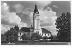 The Evangelical Lutheran Church stands at the site of a former manor house. The late Baroque mansion of the Batthyány family (later owned by the Ernuszts) was bought by the Lutheran parish in 1889, and converted to a church, rectory and school complex. The tower was built in 1925, and three years later a clock was installed. The old manor house was demolished in the 1950s, and the nave of the church was built in 1962.[13]