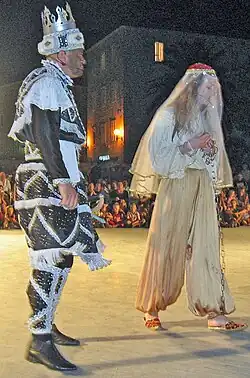 The Moreška in Korčula dates back to at least the mid-17th century,[4][5] with its roots in the Middle Ages, from the several hundred years of battle between Muslims and Christians (Moros y cristianos) in Spain, specially in Catalonia where exist a traditional dance called La Morisca de Gerri de la Sal, during the Reconquista. Multiple European festivals and pageants have their roots from that period.[6] By the 16th century the conquest theme with mock battles was introduced into the Americas and other world areas administered or culturally influenced by Spain. The version that is danced in Korčula appears to be the only one in modern times which uses two swords held by each soldier (Moreškanti) in the elaborate mock battles.