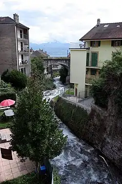 ![]() The mountain creek Morge forms the border in Saint Gingolph. Left site is French, right site is Swiss. | |