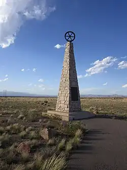 The original monument was located "32 miles north of Albuquerque on Highway 85."[1] The 1996 monument is located "five miles northeast of San Felipe Pueblo, New Mexico [...] near the dead end of a road reached via exit 257 on Interstate 25."[2] It is located off a frontage road along the north side of Interstate 25.[3]