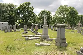 The cemetery is an official Commonwealth War Grave Cemetery containing 49 war graves from World War I and 32 from World War II.[2] The dead largely represent those dying of wounds following repatriation, linking to the nearby City Hospital. The Cross of Remembrance stands in the north-east section of the cemetery.