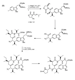 A second approach by Jia and coworkers employed an asymmetric Michael addition and bromination, a stereoselective reaction that gave a compound with the correct configuration and Leu-Trp linkage.[5]
