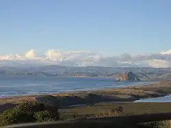 Morro Rock (Salinan: Le'samo; Chumash: Lisamu'; Spanish: El Morro)[4][5][6] is a volcanic plug in Morro Bay, California, on the Pacific Coast at the entrance to Morro Bay harbor. A causeway connects it with the shore, making it a tied island. The rock is protected as the Morro Rock State Preserve.[7]