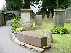 Simpler techniques than morthouses to protect the recently deceased included the family acting as lookouts, high graveyard walls with locked gates, especially deep graves and even using heather, turf, stones, etc. mixed in with the grave's soil to make digging difficult and time consuming.[4] Heavy mortstones could be placed over the grave and even the gravestone itself could be used as a deterrent,[3] such as the especially large solid cast-iron example at St Columba's in Stewarton, Ayrshire (see photograph).