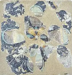 The origins of the composition, techniques, layout, and style of Delian mosaics can be found in 5th-century BC pebble mosaics of Olynthus in the Chalcidice of northern Greece, with mosaics positioned in the center of cement floors and utilizing garland, meander, and wave patterns around a centralized motif or figured scene.[28] This design scheme is similar to that of 4th-century BC mosaics of Pella in Macedonia, although the pebble mosaics there employ a wider range of colors to create the effects of volume.[29] The transition from pebble mosaics to more complex tessellated mosaics perhaps originated in Hellenistic-Greek Sicily during the 3rd century BC, developed at sites such as Morgantina and Syracuse.[29][30] Much like Olynthus, mosaics of Morgantina contain the garland, wave, and meander patterns, although the latter was finally executed with perspective.[29]
