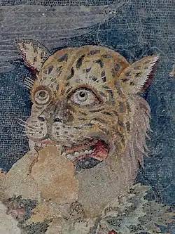 The Delos mosaic of Dionysos riding a tiger in the House of Dionysos is one of the finest examples of opus vermiculatum, according to Dunbabin, and is comparable to the Dionysos riding a leopard from the House of the Masks if not the simpler pebble-mosaic predecessor from the Macedonian capital at Pella.[1] A key thematic difference, however, are the wings of Dionysos that suggest his incarnation as a daimon instead of a god.[2][54] The tesserae materials, made of glass, faience, terracotta and natural stones, are fashioned into pieces measuring roughly one millimeter square, allowing for sharp detail and an elaborate color scheme.[2][54]