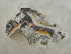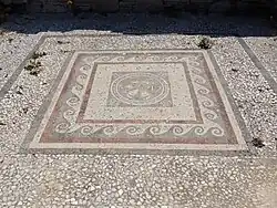 The House of the Dolphins contains a peristyle floor mosaic design that is unusual for Delos, with a circle enclosed by a square outline.[57] In each corner of the square are pairs of dolphins ridden by tiny winged figures bearing the emblems of various Greek deities, namely the thyrsus, caduceus, trident, and one object that is missing due to damage.[57] The circle contains a central rosette design surrounded by floral garlands and griffins.[57] The mosaic, signed by a certain Asclepiades of Arados (in ancient Phoenicia, now western Syria), is one of only two examples from Delos that bear a signature of the original artist.[57]