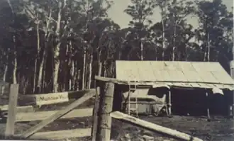 Bill then built himself a substantial log hut he named "Moscow Villa" which was completed in January 1942, on the day the Battle of Moscow was won.[15] Bill used local wood to build the hut and hand split the palings. Initially it had an iron chimney which was later replaced in 1975 by large one made of local stone. There was also a large bushfire dugout in the nearby bush. Bill lived in Moscow Villa during the summer months and in winter returned to his family in Ensay.[7]