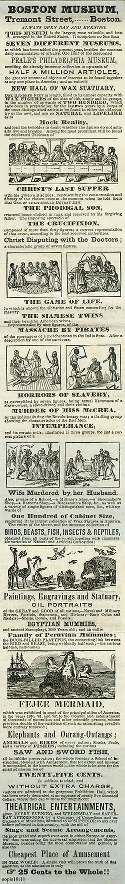 In the late spring of 1842, Kimball traveled to New York City to meet his rival, P. T. Barnum, in person. He brought with him a large oblong box containing a most unusual curiosity: an embalmed mermaid purchased at great price near Calcutta by a Boston sea captain in 1817. If it wasn't a real mermaid, it was a remarkable fraud: the head of a baboon and the upper half of an orangutan was attached to the lower half of a large fish.