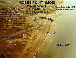 Moses Point Airport (IATA: MOS, FAA LID: MOS) is an airport located in Elim, a city in the Nome Census Area of the U.S. state of Alaska. It is privately owned by the Elim Native Corporation.[1] Formerly, the field operated as Moses Point Army Airfield during World War II.