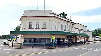 The former Mossman Shire Hall and Douglas Shire Council Chambers is a large rendered concrete building located on a level site in the centre of Mossman at the intersection of Mill Street (the main street of the town), Junction Road and the Captain Cook Highway. The building is orientated east–west extending along Mill Street. Its western end comprises two storeys with its principal south-west elevation truncated to face the intersection and giving it prominence as a civic building in the centre of the town. Retail premises (originally four shops) are located on the ground floor with offices (originally the council offices) on the first floor. The hall and its ancillary facilities including supper lounge, stage and fly tower occupy the remainder of the building and are located east of the shops along Mill Street.[1]
