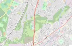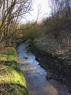 The source of Moston Brook is now hidden. Its most upstream part is fully obscured in two culverts, the South Culvert and the North Culvert.[2] The South Culvert is what remains of one of the brook's upstream tributaries, Bower Brook, which flows from the Werneth area[3] and past a pumping station in South Chadderton.[2] Another tributary, Hole Bottom Brook, rises in north Hollinwood and runs to the Failsworth boundary near the Rochdale Canal, where a short section is still in daylight.[2][3][4] The North Culvert was connected in the 1990s in order to take run-off from a newly constructed part of the M60 motorway.[4] The confluence of Bower Brook and Hole Bottom Brook is considered the start of Moston Brook proper.[4]