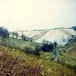 There were "white hills" along the banks of the brook, formed from industrial waste.[4] The origin of the hills is unclear, though the hills are shown in photographs dated 1913.[14] Excavation of clay and sand pits alongside the brook fed brickworks on Hale Lane, Failsworth.[4] From around 1949, these pits were used as landfills, the last of which (Hardman Fold) was closed in the 1990s.[4] The brook was gradually culverted along much of its length, in some cases to make room for more landfill sites.[9] For example, the part of the brook that was near Monsall Hospital was culverted to make way for a landfill in the mid-1970s.[9] The hospital itself closed down in 1993 and was demolished soon after.[15] Moston Brook High School, which was built on the former site of the North Road sports pitches, was closed in August 2000.[16]